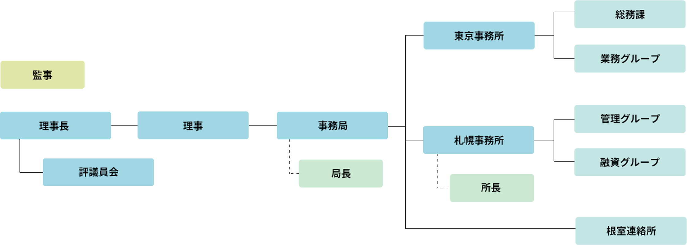 札幌事務所は、所長が統括し、管理グループと融資グループが存在します。