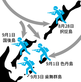 1945年8月9日、ソ連は、当時まだ有効だった日ソ中立条約に違反して対日参戦し、日本がポツダム宣言を受諾した後の同年8月28日から9月5日までの間に、北方四島すべてを占領しました。その後、現在まで、ロシアによる不法占拠が続いています。
