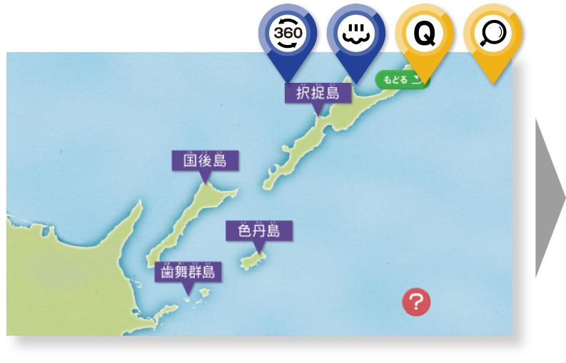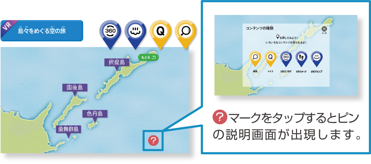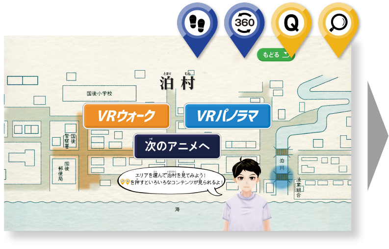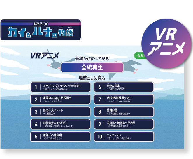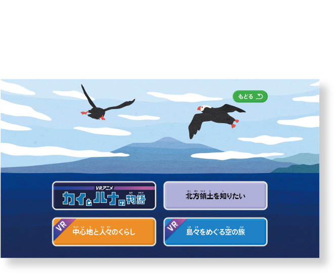 北方四島VRでは、アニメのストーリーに沿って利用できる「ストーリー」モードと、各コンテンツを自由に体験できる「自由探索」モードの二つのモードをご用意しています。
