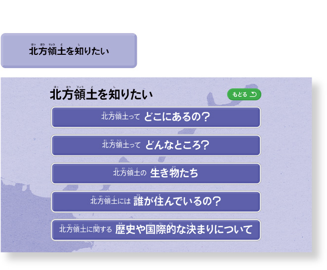 タイムトリップした主人公カイを通して、北方四島の当時の豊かな自然や島での暮らしを楽しく学べる内容になっています。